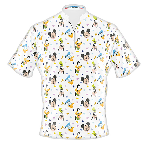 This high-tech Disney jersey is durable and made from moisture-wicking fabric. It has a sash collar with a 3/4 zip front. The colorful design is dye-sublimated. The jersey is washable in cold water. For best results, not use bleach or fabric softener, air dry. Do not use abrasives to clean the shirt, as they may snag the fabric. The jersey is proudly made in the USA. See chart below for sizing information.